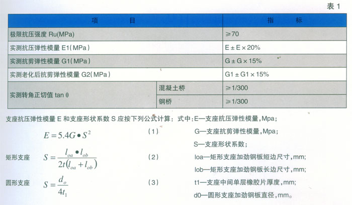 橡膠屬非線性的高分子彈性材料,在密閉情況下,幾乎是不可壓縮的,只有在變形較小時,才可近似地作為線性體,其彈性模量與硬度及支座的外形有著密切的關(guān)聯(lián)。只有合理的設(shè)計,才有良好的功用。衡水金泰工程橡膠有限公司,從事橡膠減震產(chǎn)業(yè)已達數(shù)十年,對于客戶的特殊要求一貫認真對待,設(shè)計上精益求精,生產(chǎn)上一絲不茍,能夠最大限度滿足市場的需求。本冊所涉及的橡膠支座,其設(shè)計參數(shù)、設(shè)計要求、驗算方法及加工工藝是按照GB20688.4-2007《橡膠支座第四部分:普通橡膠支座》的標準嚴格執(zhí)行。其性能見表1: