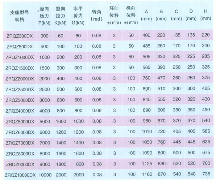 ZRQZ-DX單向位移型自潤(rùn)球鉸支座參數(shù)表    表2