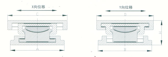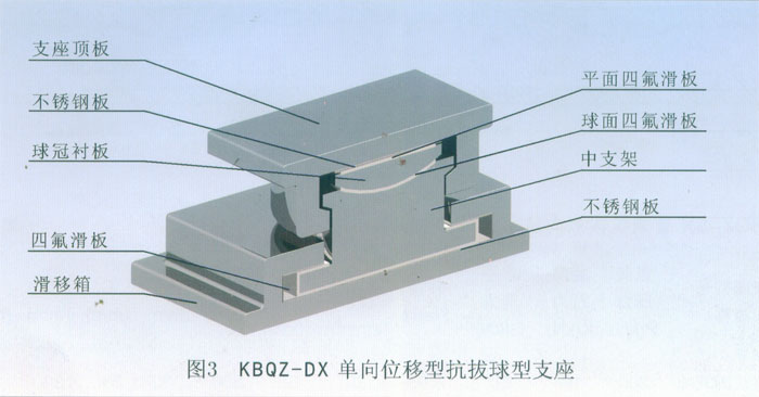 4 KBQZ系列抗拔球型支座 本系列支座主要分為抗拔球型支座和減震抗拔球型支座,下面對其進(jìn)行分類介紹。4.1抗拔球型支座 此類支座分為固定型、單向位移型和雙向位移型,支座結(jié)構(gòu)如圖3。其主要由支座頂板、不銹鋼板、平面聚四氟乙烯滑板、球冠襯板、球面聚四氟乙烯滑板、中支架、聚四氟乙烯滑板、不銹鋼板和滑移箱組成。支座中的相對滑移部件之間,采用目前世界上摩擦系數(shù)最低的聚四氟乙烯滑板和不銹鋼板相隔,充分減小了摩擦阻力,使各部分之間的運動流暢,避免爬行現(xiàn)象的產(chǎn)生。本類支座通過球面聚四氟乙烯滑板上部構(gòu)件沿著球面相對于下部構(gòu)件的轉(zhuǎn)動實現(xiàn)轉(zhuǎn)角(常用值為0.02rad),在工作過程中支座沿著滑移箱滑道滑動實現(xiàn)水平位移。 豎向壓力的傳遞是通過支座頂板,不銹鋼板,平面聚四氟乙烯滑板,球冠襯板,球面聚四氟乙烯滑板,中支架,聚四氟乙烯滑板,不銹鋼板依次疊加傳至滑移箱底板。 豎向拔力的傳遞是通過支座頂板和中支架的抗拔接觸面將作用于支座頂板上的上.拔力傳至中支架,再由中支架與滑移箱之間的抗拔四氟滑板和不銹鋼板將力傳至滑移箱頂板。 水平力的傳遞是通過支座頂板側(cè)壁與中支架側(cè)壁之間.的接觸面將水平力傳至中支架,再由中支架與滑移箱的接觸面?zhèn)髦粱葡鋫?cè)壁根部。 固定型抗拔球型支座不設(shè)滑移箱。4.1.1普通抗拔雙向位移型球型支座KBQZ-SX普通抗拔雙向位移型球型支座參數(shù)表 表74.1.2普通抗拔單向位移型球型支座KBQZ-DX普通抗拔單向位移型球型支座參數(shù)表 表84.1.3普通抗拔固定型球型支座KBQZ-GD普通抗拔固定型球型支座選用參數(shù)表 表9