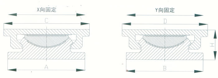 4 KBQZ系列抗拔球型支座 本系列支座主要分為抗拔球型支座和減震抗拔球型支座,下面對其進(jìn)行分類介紹。4.1抗拔球型支座 此類支座分為固定型、單向位移型和雙向位移型,支座結(jié)構(gòu)如圖3。其主要由支座頂板、不銹鋼板、平面聚四氟乙烯滑板、球冠襯板、球面聚四氟乙烯滑板、中支架、聚四氟乙烯滑板、不銹鋼板和滑移箱組成。支座中的相對滑移部件之間,采用目前世界上摩擦系數(shù)最低的聚四氟乙烯滑板和不銹鋼板相隔,充分減小了摩擦阻力,使各部分之間的運動流暢,避免爬行現(xiàn)象的產(chǎn)生。本類支座通過球面聚四氟乙烯滑板上部構(gòu)件沿著球面相對于下部構(gòu)件的轉(zhuǎn)動實現(xiàn)轉(zhuǎn)角(常用值為0.02rad),在工作過程中支座沿著滑移箱滑道滑動實現(xiàn)水平位移。 豎向壓力的傳遞是通過支座頂板,不銹鋼板,平面聚四氟乙烯滑板,球冠襯板,球面聚四氟乙烯滑板,中支架,聚四氟乙烯滑板,不銹鋼板依次疊加傳至滑移箱底板。 豎向拔力的傳遞是通過支座頂板和中支架的抗拔接觸面將作用于支座頂板上的上.拔力傳至中支架,再由中支架與滑移箱之間的抗拔四氟滑板和不銹鋼板將力傳至滑移箱頂板。 水平力的傳遞是通過支座頂板側(cè)壁與中支架側(cè)壁之間.的接觸面將水平力傳至中支架,再由中支架與滑移箱的接觸面?zhèn)髦粱葡鋫?cè)壁根部。 固定型抗拔球型支座不設(shè)滑移箱。4.1.1普通抗拔雙向位移型球型支座KBQZ-SX普通抗拔雙向位移型球型支座參數(shù)表 表74.1.2普通抗拔單向位移型球型支座KBQZ-DX普通抗拔單向位移型球型支座參數(shù)表 表84.1.3普通抗拔固定型球型支座KBQZ-GD普通抗拔固定型球型支座選用參數(shù)表 表9